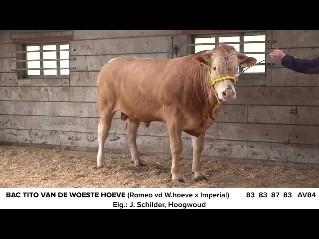 De stier is zeer gevoelig aan de neusring. Het binnenbekken is niet gemeten. De stier wilde niet meewerken waardoor risico op beschadiging te groot was.BAC Tito van de Woeste Hoeve is een stier met opvallend veel breedte in de voorhand. Het bekken is voldoende lang en opvallend breed. De stier is zeer goed bespierd met veel ronding in de bil. Tito vd Woeste Hoeve is een stier met een prachtige vader en moederlijn. Het is een zeer correcte evenredige stier met een strakke bovenbouw en keurig beenwerk waarbij juist zijn hele beste bespiering en zijn diepe voorhand opvallend zijn en daarbij in de ontwikkeling niets tekort komt. Tito is een stier met prima groeicijfers en een flink gewicht van 752 kg op 17,6 mnd op 30 maart zal hij richting 800 kg wegen op net anderhalf jarige leeftijd. Hij kenmerkt zich verder vanwege zijn rastype, hele mooie kleur en bijzondere fijnheid in huid en zeker ook in de botten. Tito zelf is gemakkelijk geboren (lag s’morgens plots in de stal) een vlot en levenslustig kalf met een draagtijd van 298 dagen.De moeder is Olijfje vd Woeste Hoeve. Een royaal ontwikkelde sterke koe met veel melk. Beste ruglijn en super beenwerk, een ras Blonde. Zij is een dochter van Imperial en Joli v.Evian. Joli is op 2-jarige leeftijd ingepunt met AV 88 en al best ontwikkeld met 1.50m schofthoogte. Zij is super fijn in vel en bot en verzorgt haar kalveren zeer goed en heeft echt veel melk. Olijfje heeft dezelfde eigenschappen als haar moeder en is ook op 2-jarige leeftijd ingepunt metAV88 en een schofthoogte van zelfs 1.52m.