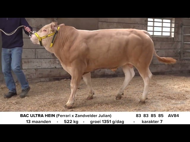 BAC Ultra Hein is een jonge stier met een fraaie lendebespiering. De bovenbouw is strak. Het bekken is licht hellend. De stier is goed bespierd. Het beenwerk is goed gesteld en wordt goed gebruikt. De moeder van Ultra Hein, Olivia is een mooie foktypische blonde koe met als vader Zandvelder Julian (volle broer van bekende stier Grandeur van fokker familie Kleine), heeft mooi uier en genoeg melk. Op de foto oogt zij iets schraal dit komt doordat zij kort na het spenen alweer kalfde. De stier Ferrari spreekt voor zich.