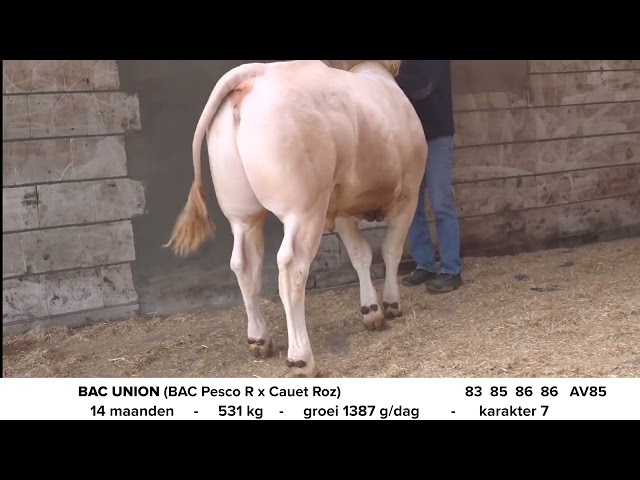 BAC Union is een jeugdige stier met voldoende ontwikkeling en goed van rastype. De rug is strak. Het bekken is goed geplaatst. De stier is goed bespierd en heeft zeer goed beenwerk. De moeder van Union is een Cauet Roz koe die wij ooit als drachtige vaars gekocht hebben, zij is een zeer mak en vleestypische harde koe die met weinig voer in goede conditie bleef en het kalf veel melk kon geven. De vader is BAC Pesco R die veel mooie nakomeling op ons bedrijf heeft gebracht. Deze stier is nog geen 5 jaar oud en is nu bij de familie van de Esker aan het werk en ontwikkelt zich steeds mooier.