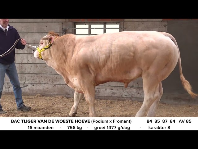 BAC Tijger van de Woeste Hoeve is een stier met veel breedte in de voorhand. De kop is sprekend. Opvallend is de lendebespiering. De stier heeft veel breedte in de bovenbouw, bekken en de broek. Het beenwerk wordt goed gebruikt. Tijger vd Woeste Hoeve is een zeer correcte stier met een strakke en brede bovenbouw, zeer fijn, prachtige kleur en enorm veel rasuitsraling. Tijger blinkt zoals op de foto’s te zien uit in zijn bespiering. Het groeivermogen van Tijger is erg goed zoals we aan de weegcijfers kunnen zien. De laatste daggroei van 1.750kg maakt hem een van de betere groeiers van deze opfokronde. De laatste weging had Tijger al een best gewicht van 756kg. Op 30 maart tijdens de veiling zal hij dus ongeveer op de 820 kg zitten. De moeder van Tijger is Impatiente-dochter Orchidee. Zij is in haar bouw een kopie van haar moeder te noemen. Impatiente is ingepunt met de bijzonder hoge Franse score van FR 82. Ook mag je Impatiente een hele moderne koe noemen, prachtige bespiering en zeer fijn in huid en skelet, strakke bovenbouw en super op haar benen Als vader heeft zij Comedien die in ieder geval bekend staat als een stier die super karakters vererft. Waarschijnlijk komt het super karakter van Tijger aangeduid met de score 8 genetisch gezien bij Comedien vandaan. Impatiente was een geweldig indrukwekkende koe met sterk beenwerk sterke rug en mooie evenredige breedte van voor tot achter. Bijzonder was haar beste bespiering waarbij een schitterende ronding in haar bil. Ook haar brede bekken vererft ze goed door. Impatiente woog op haar top 1243 kg levend gewicht.